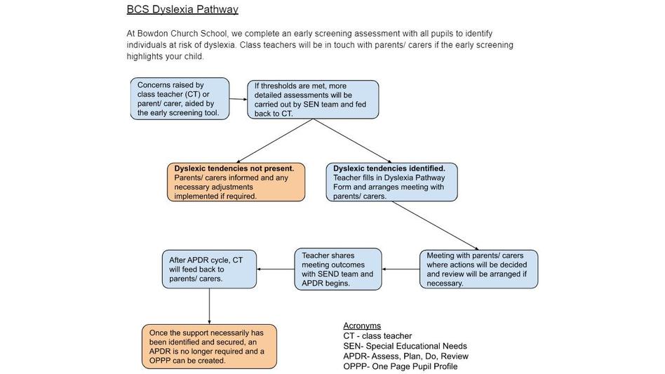 We find that most of the time, for pupils with dyslexic tendencies, their needs can be met through Quality First Teaching strategies and by creating a dyslexia friendly classroom. If we feel that your child's needs are being met at school, a referral does not need to be made. We can create something called a One Page Pupil Profile (OPPP) to summarise how best to support a learner's needs in the classroom.